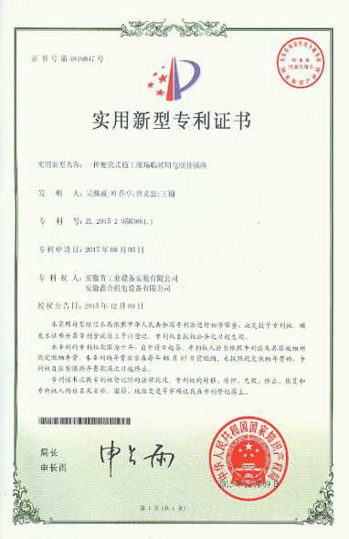 近日,從國(guó)家知識(shí)產(chǎn)權(quán)局傳來(lái)喜訊,公司申報(bào)的“一種便攜式施工現(xiàn)場(chǎng)臨時(shí)用電聯(lián)排插座”實(shí)用新型專利獲批,并頒發(fā)了國(guó)家實(shí)用新型專利證書。