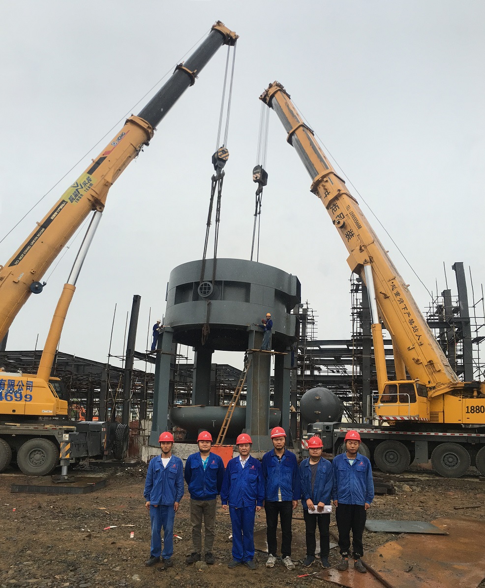 本次吊裝的反應(yīng)器中段部分重達(dá)220噸,分公司領(lǐng)導(dǎo)高度重視,吊裝前期,邀請(qǐng)公司總工吳繼成、總工辦主任牛守義和安全部王岳濤經(jīng)理親臨項(xiàng)目部參與設(shè)備吊裝的專題方案討論定稿工作。當(dāng)日上午,吊裝現(xiàn)場準(zhǔn)備工作緊張卻又有條不紊的進(jìn)行,項(xiàng)目經(jīng)理李子鳳向全體“參戰(zhàn)”員工進(jìn)行了安全交底,工作人員對(duì)兩臺(tái)分別為500T、350T吊車的站位及性能再次確認(rèn),現(xiàn)場機(jī)具、人員均按既定方案實(shí)施。分公司經(jīng)理史崇松、業(yè)主單位負(fù)責(zé)人、監(jiān)理全程在現(xiàn)場“督戰(zhàn)”,全體工作人員經(jīng)過四個(gè)小時(shí)的奮戰(zhàn),吊裝作業(yè)圓滿結(jié)束。
