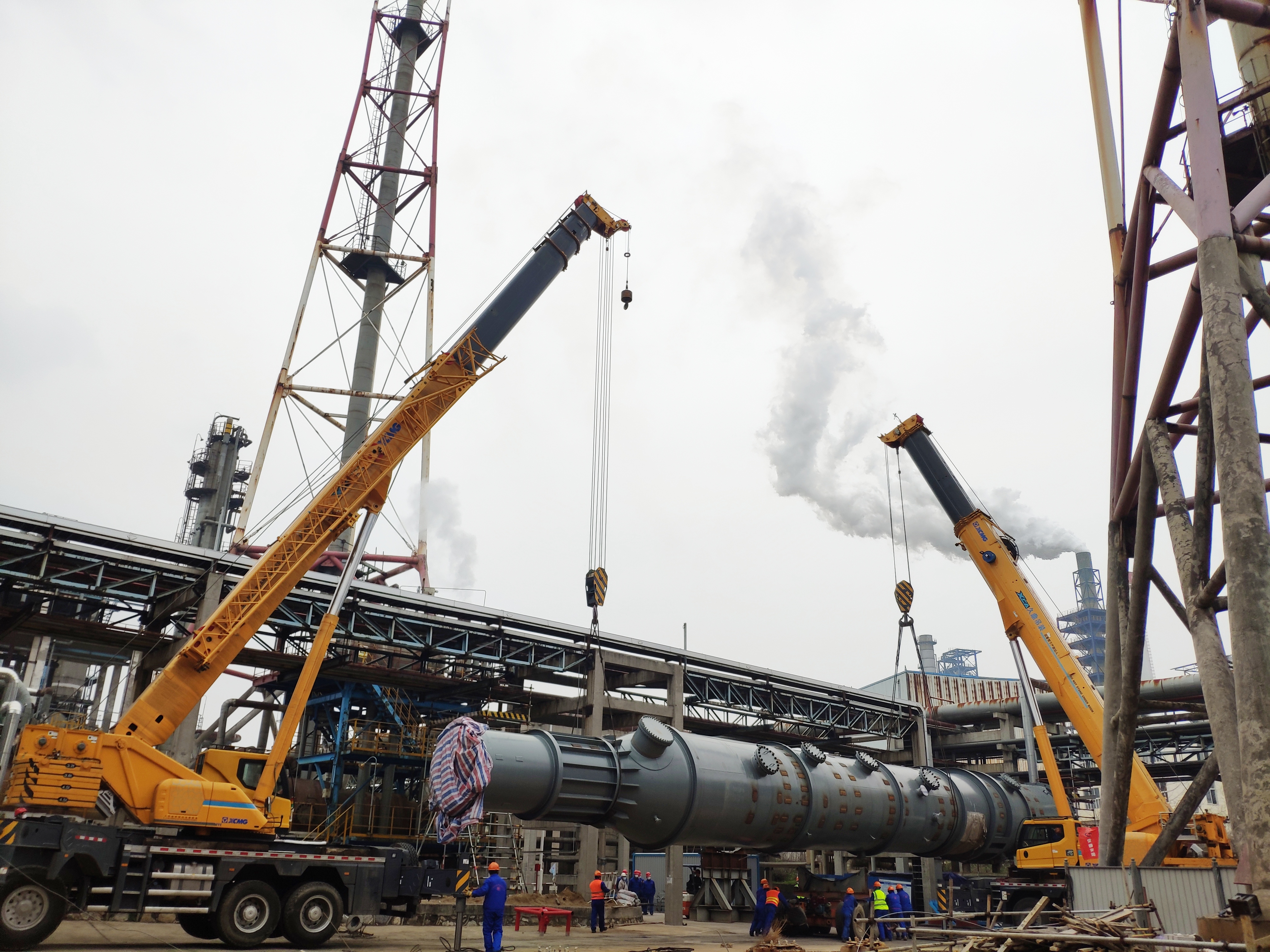 該脫硫塔設(shè)備分為上下兩段,僅下段設(shè)備就長達33米,重達58噸,體積十分龐大,但施工作業(yè)場地狹小、固有構(gòu)筑物障礙多、吊重荷載大等諸多困難,造成設(shè)備無法一次性運至施工現(xiàn)場進行“穿衣戴帽”。面對艱巨任務(wù),項目部多次優(yōu)化倒運方案,提前合理部署,按照方案采用額定荷載分別為220噸和90噸的汽車吊實施雙機抬吊作業(yè)。