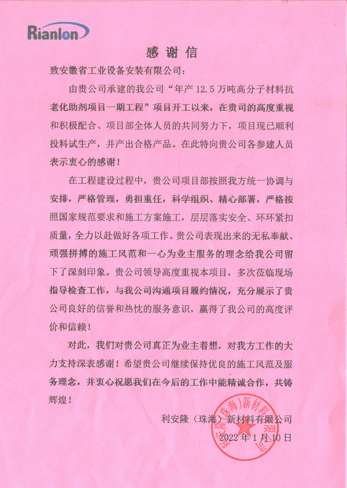 近日,利安?。ㄖ楹#┬虏牧嫌邢薰鞠虬不瞻惭b公司致感謝信,對安徽安裝公司“年產12.5萬噸高分子材料抗老化助劑項目一期工程”實現(xiàn)順利投產運行產出合格產品表示祝賀,對項目部全體參建人員付出的艱辛努力與貢獻給予感謝。