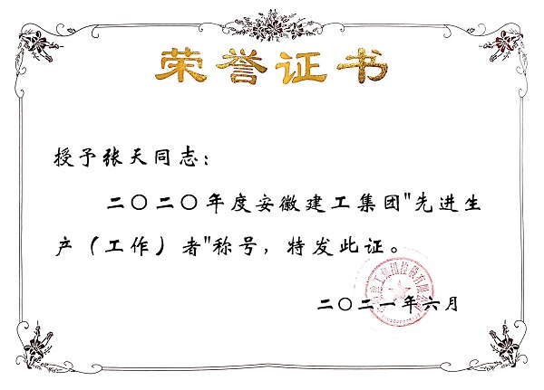 2017年5月,張?zhí)焱靖鶕?jù)工作需要遠赴新疆烏蘇項目上,在不到兩年的時間內(nèi),嚴謹求實,勤奮刻苦,兢兢業(yè)業(yè),時時處處嚴格要求自己,始終以飽滿的工作熱情、扎實的工作作風、優(yōu)異的工作成績,贏得了廣大員工的普遍好評,榮獲2020年“建工集團年度先進生產(chǎn)(工作)者”稱號。