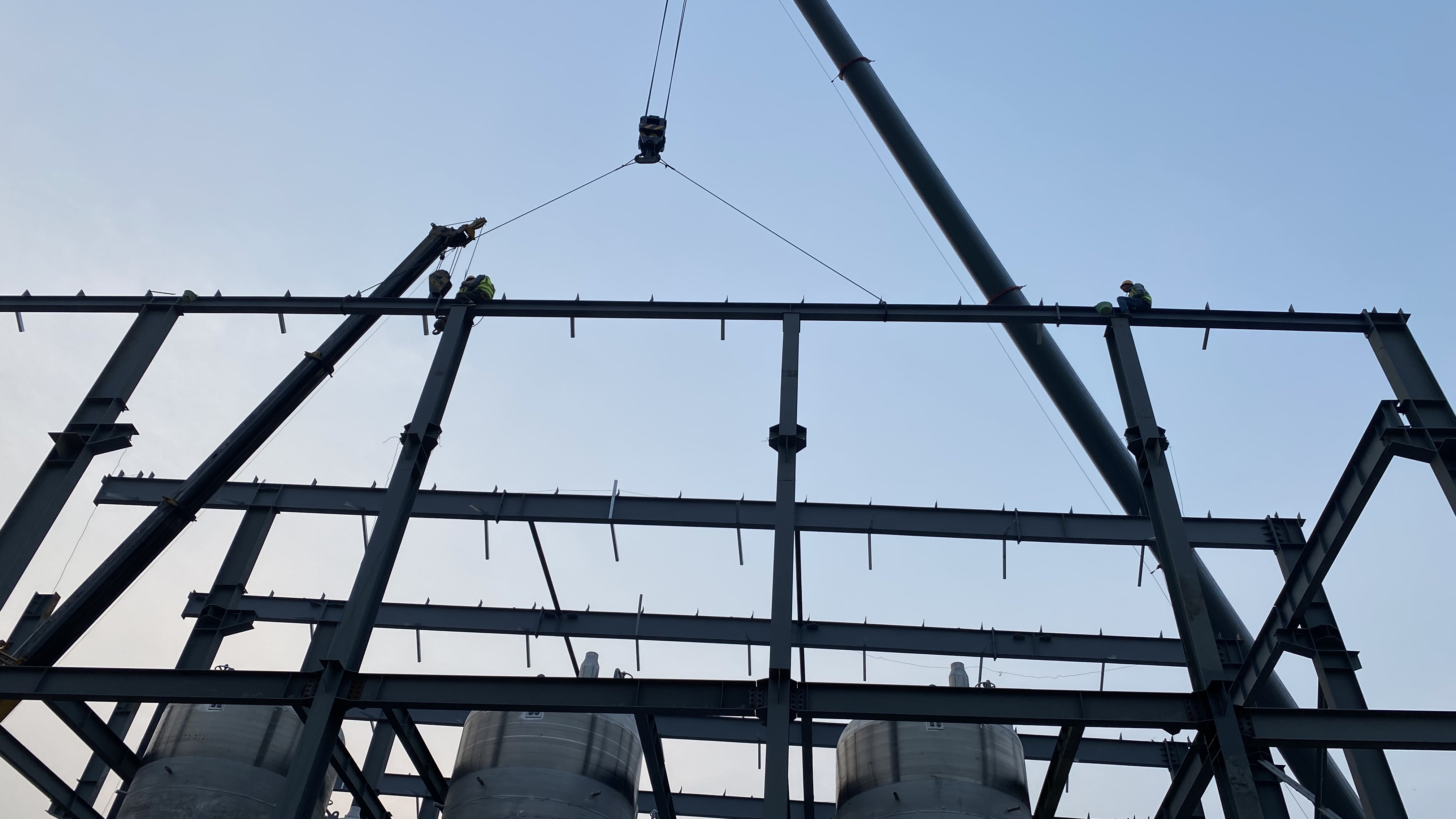 發(fā)酵車間吊車大臂高展,C區(qū)鋼結(jié)構(gòu)工程鋼梁安裝正在進(jìn)行,司索工鋼梁綁扎穩(wěn)固后,現(xiàn)場信號(hào)工發(fā)出清晰信號(hào),經(jīng)驗(yàn)豐富的司機(jī)操控著吊車將鋼梁緩緩升起,20米的高空上,兩名安全防護(hù)的工人等待著鋼梁靠近,停穩(wěn)、就位、穩(wěn)固、矯正、固定...一道道鋼梁就這樣架起,發(fā)酵車間的金屬骨架就這樣拔地而起,逐步形成。