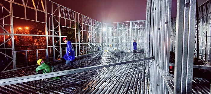 夜間綁扎三層地板鋼筋,雨天夜間搶工