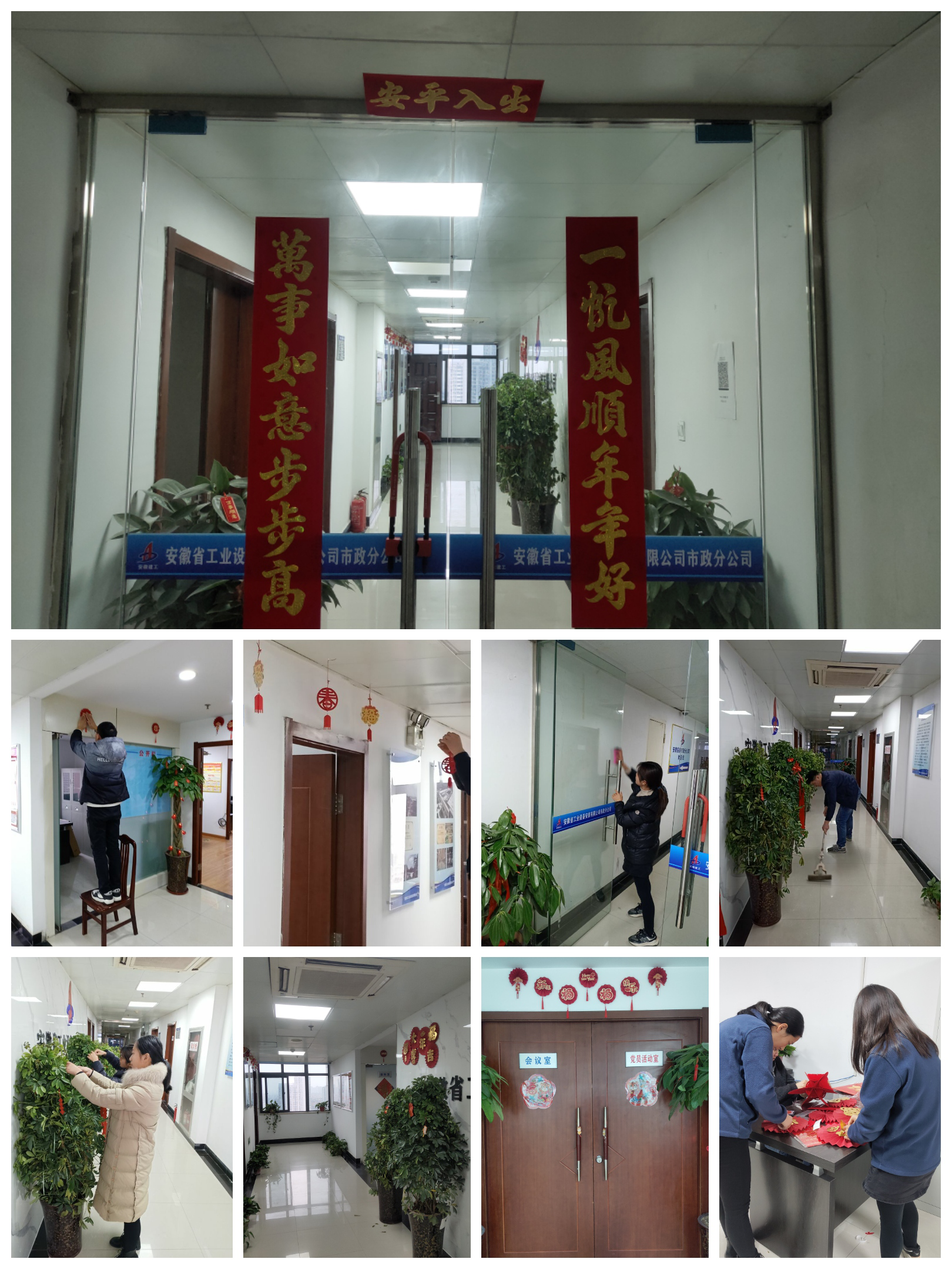 作為市政分公司掛牌成立后的第一個(gè)春節(jié),工會(huì)提前準(zhǔn)備好拉花、拉旗等喜慶裝飾物,號(hào)召機(jī)關(guān)青年、團(tuán)員自己動(dòng)手張貼。此次活動(dòng)得到大家的積極響應(yīng),員工們齊心協(xié)力、分工協(xié)作對(duì)辦公區(qū)域進(jìn)行衛(wèi)生清潔與氛圍裝點(diǎn),在機(jī)關(guān)走廊懸掛喜慶裝飾品,讓分公司處處充滿濃濃年味,紅紅火火、喜氣洋洋地迎接新一年的到來。