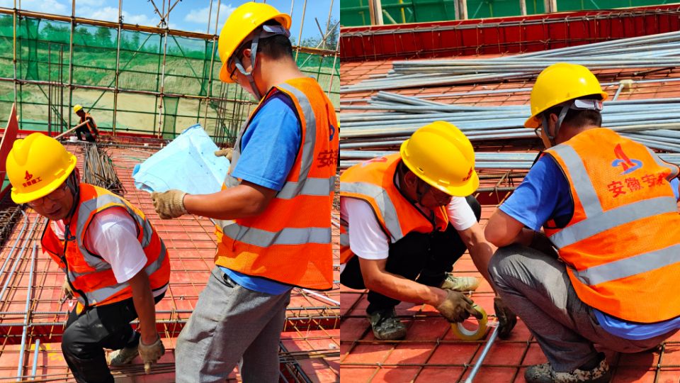 合肥分公司肥西安信立士項(xiàng)目一線工人在熱浪滾滾中堅(jiān)守崗位;圖為木工支模、貼防水卷材及地坪抹平施工。