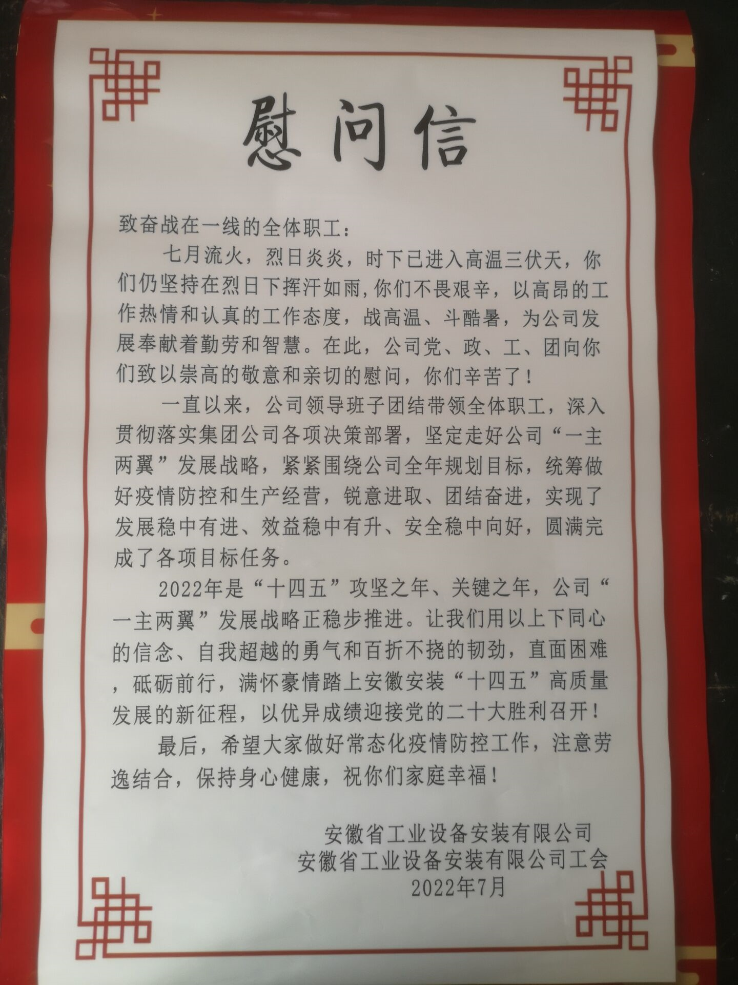 隨后在項目部會議室,李楊對集團和公司兩級“十四五”發(fā)展戰(zhàn)略與規(guī)劃進行了宣貫解讀。隨后代表公司向奮戰(zhàn)在一線的項目部員工表示慰問和感謝,送來了防暑降溫慰問品和慰問信,并與項目部員工進行了親切交談。在談話中,李楊鼓勵項目部青年員工和新大學生要樹立好正確的世界觀、人生觀和價值觀,在工作中找準定位,不斷提升業(yè)務能力,將個人的進步與企業(yè)的發(fā)展緊密地結(jié)合在一起,與企業(yè)共同成長。