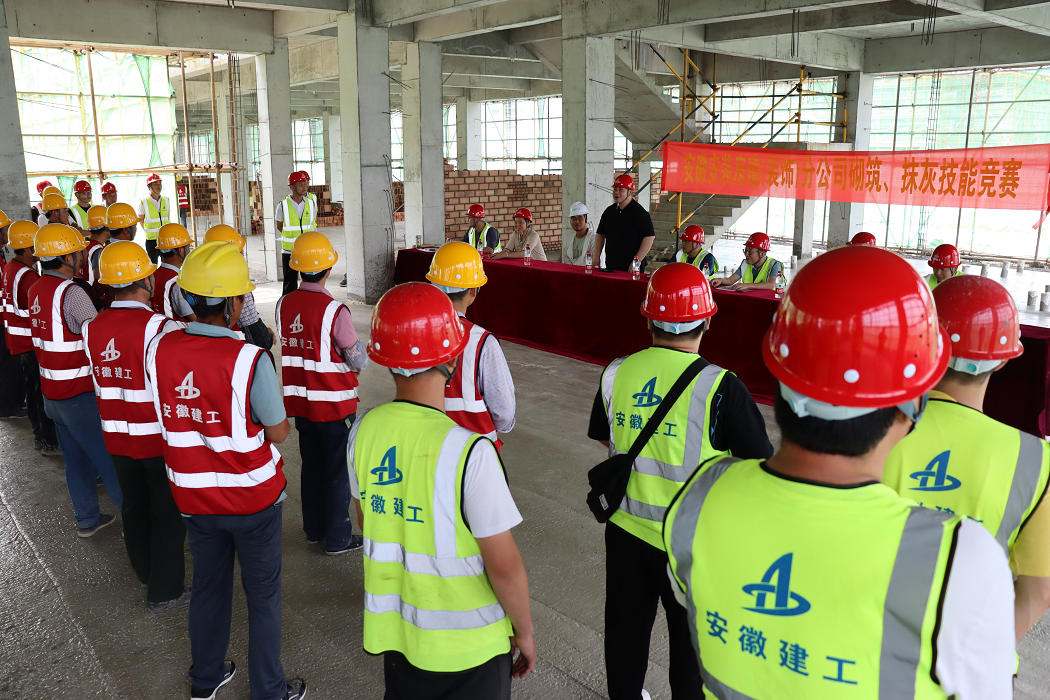 為深入學(xué)習(xí)宣傳貫徹習(xí)近平新時(shí)代中國特色社會(huì)主義思想和黨的二十大精神,大力弘揚(yáng)工匠精神,厚植工匠文化,5月31日下午,房建(裝飾)分公司黨支部在阜南縣第一小學(xué)項(xiàng)目部舉行了“學(xué)思踐悟二十大 崗位比武促發(fā)展”砌筑、抹灰技能大賽活動(dòng)。來自項(xiàng)目各勞務(wù)單位的14組參賽隊(duì)伍,20多名工人代表參加比賽。比賽邀請(qǐng)公司總工辦及分公司領(lǐng)導(dǎo)班子成員和部分項(xiàng)目經(jīng)理擔(dān)任評(píng)委。
