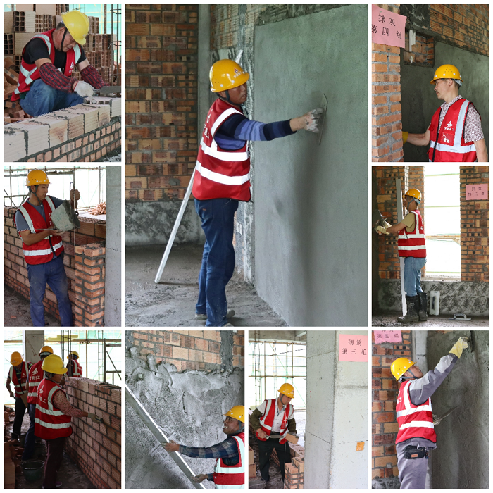 隨著分公司經(jīng)理、黨支部副書記許杰熱情洋溢的動(dòng)員講話,比賽正式拉開序幕。比賽中,選手們各顯神通,挑磚、測量、切割、砌筑、勾縫、找平、清理、抹灰等工序有條不紊,全力使自己的“作品”立面垂直、陰陽角方正、表面平整、線條順直、砂漿收水、基層濕潤。