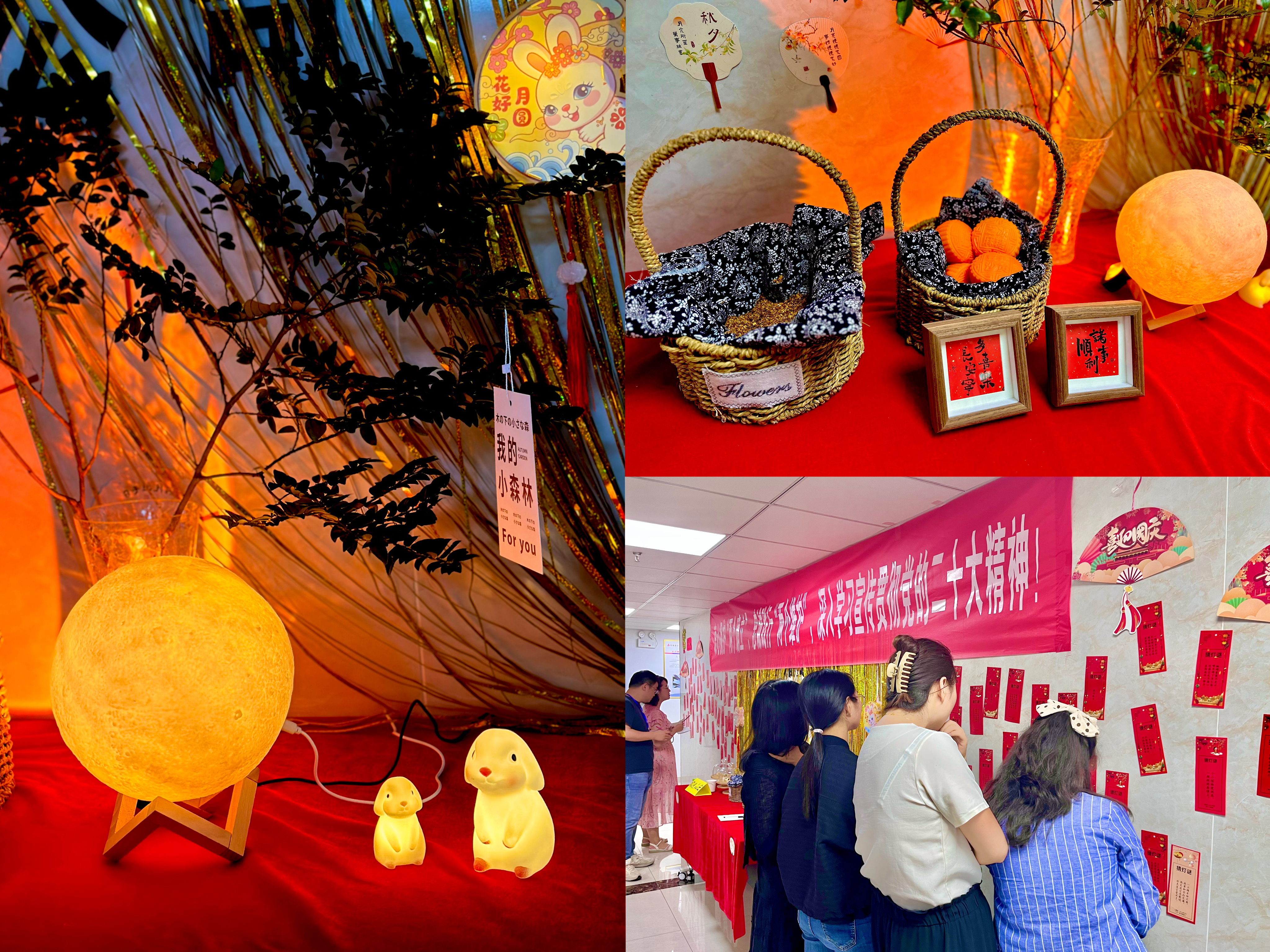 分公司工會(huì)購置月亮燈、玉桂兔、綠植、桂花籃、燈籠、貼畫等各種裝飾物,把整個(gè)分公司裝扮得喜慶又熱鬧,擺放各式月餅、綠豆糕等供大家品嘗。舉辦“猜燈謎”小游戲,在分公司背景墻貼上“燈謎”小卡片,大家紛紛駐足觀賞、熱情參與,節(jié)日氣氛值瞬間拉滿。