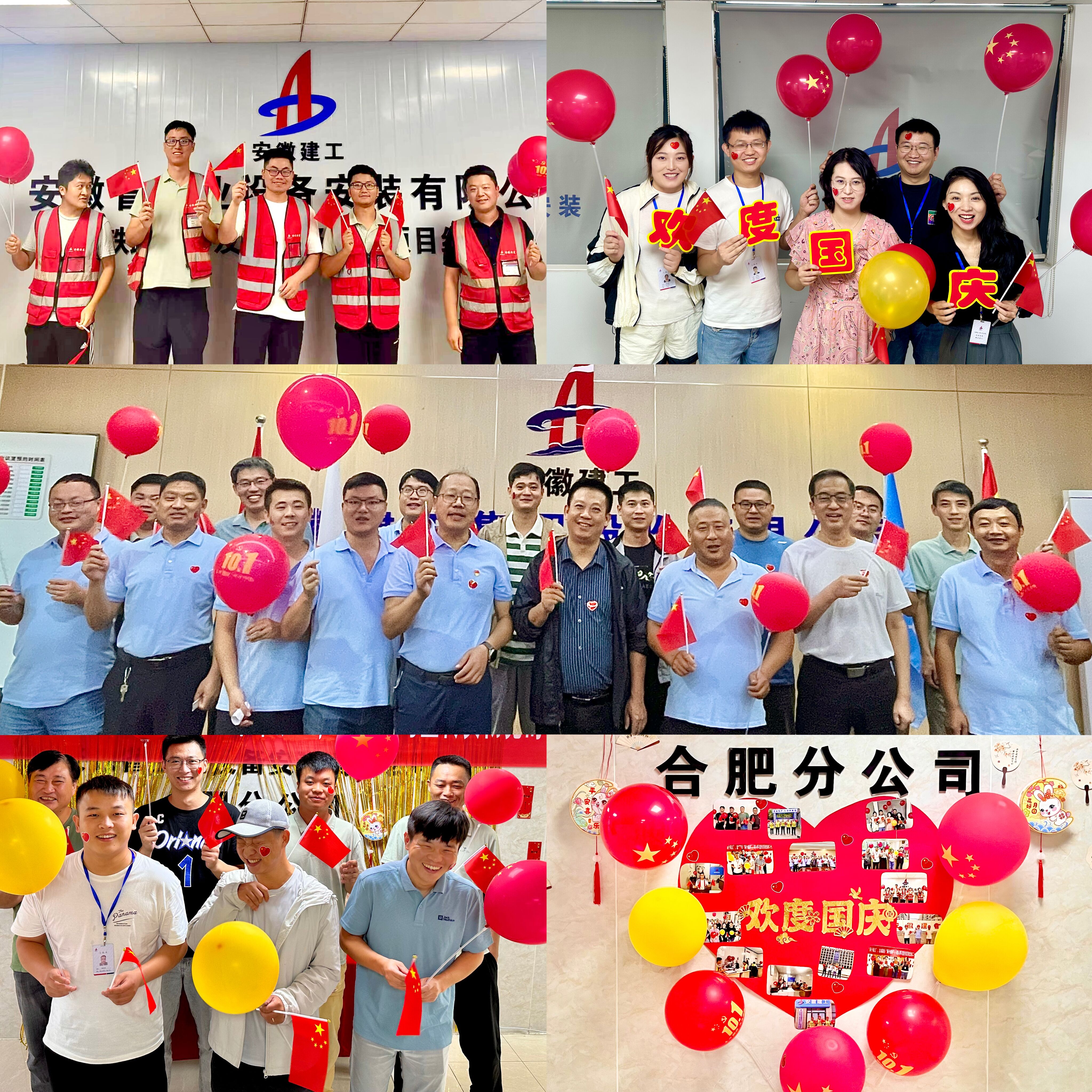 分公司機(jī)關(guān)和各項(xiàng)目部人員手持國旗、氣球和祝福標(biāo)語,共同拍攝集體大合照為祖國母親獻(xiàn)上生日祝福,他們臉上的“一抹紅色”在燦爛笑容的映襯下顯得更加明亮耀眼。大家的合照被紅色的“心”連在一起,象征著和祖國母親心連心、同歡樂,共團(tuán)圓。