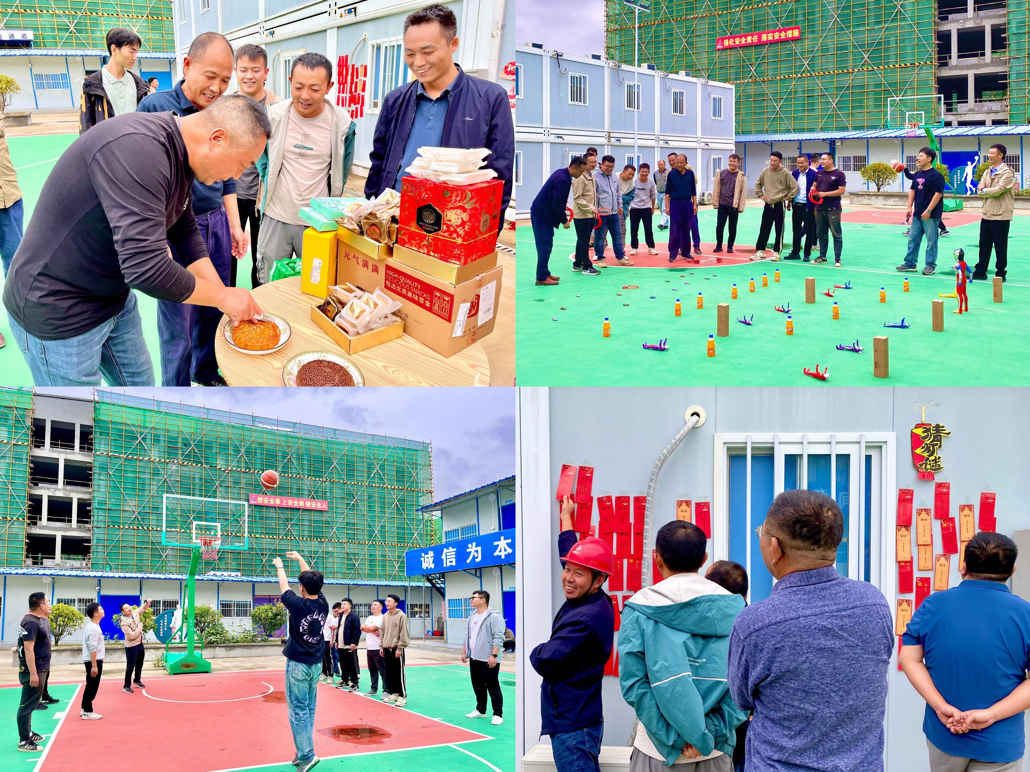 節(jié)前,分公司工會(huì)還前往岳西中學(xué)建設(shè)項(xiàng)目(一期)安裝專業(yè)分包工程項(xiàng)目部開展了雙節(jié)慶祝活動(dòng)。在項(xiàng)目現(xiàn)場(chǎng),大家共同分享團(tuán)圓大月餅,一起品嘗節(jié)日“美味”,組織開展猜燈謎、趣味套圈、定點(diǎn)投籃等游戲活動(dòng),設(shè)置“投籃最佳射手”等獎(jiǎng)項(xiàng)。項(xiàng)目部人員熱情踴躍參加,場(chǎng)面熱鬧非凡,爽朗的笑聲回蕩在整個(gè)項(xiàng)目現(xiàn)場(chǎng),在工作之余愉悅身心,緩解工作壓力,同時(shí)也增進(jìn)大家之間的溝通交流,進(jìn)一步增強(qiáng)團(tuán)隊(duì)合作精神和企業(yè)凝聚力、向心力。