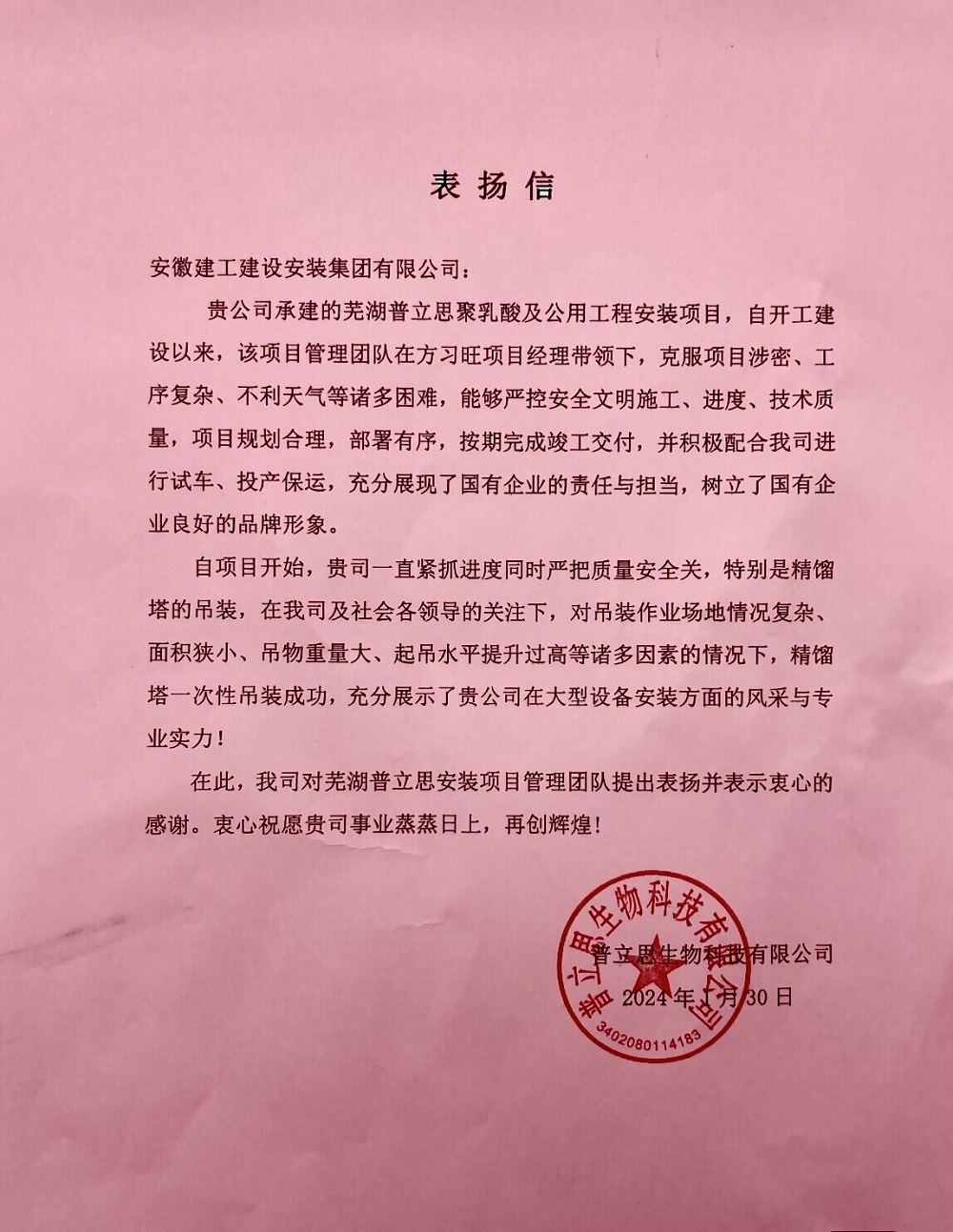 近日,建工安裝蕪湖普立思聚乳酸及公用工程安裝項(xiàng)目收到業(yè)主表?yè)P(yáng)信,對(duì)項(xiàng)目團(tuán)隊(duì)在項(xiàng)目建設(shè)過程中主動(dòng)作為、攻堅(jiān)克難,敢于擔(dān)當(dāng)、全力拼搏的精神予以充分肯定和高度認(rèn)可,對(duì)公司及項(xiàng)目全體參建人員的辛苦付出和不懈努力表示衷心感謝和誠(chéng)摯問候。