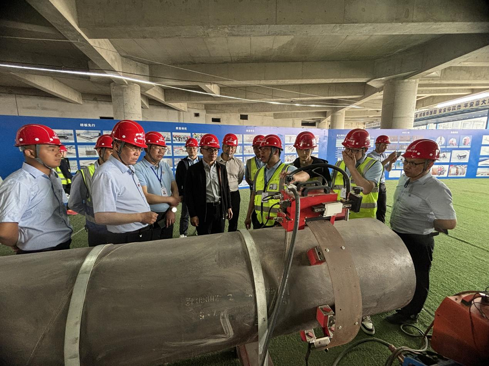 隨后一行人前往項(xiàng)目施工現(xiàn)場觀摩,雙方對現(xiàn)場的協(xié)調(diào)管理、BIM管綜布局、多工種交叉作業(yè)等提出了各自的經(jīng)驗(yàn)和見解,王永利一行特別對項(xiàng)目上采用的焊接機(jī)器人技術(shù)表示了贊賞。