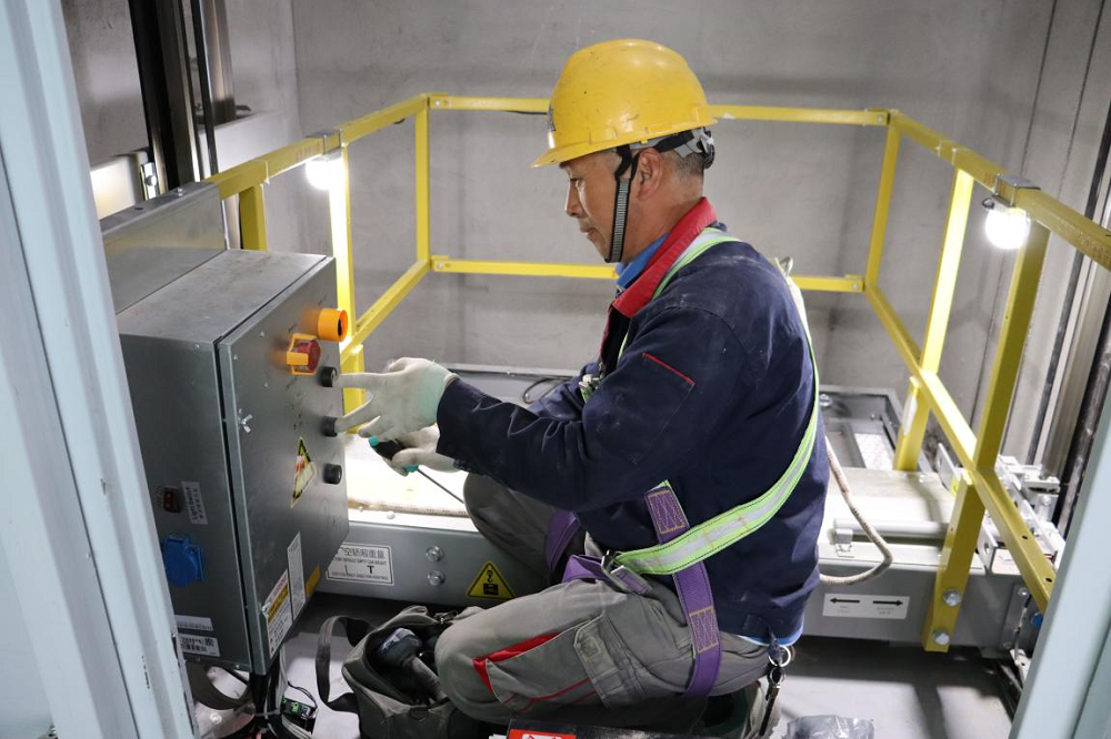 合肥市包河區(qū)衛(wèi)崗?fù)跣l(wèi)片區(qū)城市項(xiàng)目現(xiàn)場(chǎng)安裝人員在進(jìn)行電梯轎頂檢修