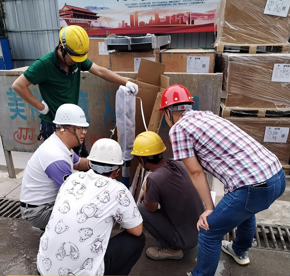 安徽大學(xué)綠色產(chǎn)業(yè)創(chuàng)新基地項目現(xiàn)場安裝人員正在進(jìn)行電梯開箱檢驗