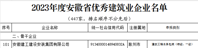 近日,安徽省住房和城鄉(xiāng)建設廳、安徽省交通運輸廳、安徽省水利廳、安徽省通信管理局聯(lián)合發(fā)布《關于公布2023年度安徽省優(yōu)秀建筑業(yè)企業(yè)名單的通知》(建辦〔2025〕41號),安徽建工建設安裝集團有限公司入選“2023年度安徽省優(yōu)秀建筑業(yè)企業(yè)”。